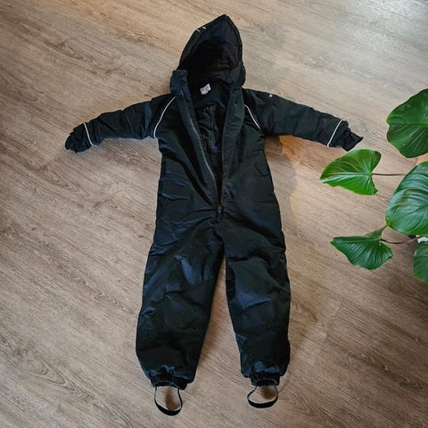 VRS Børne Flyverdragt i størrelse 104, designet til både piger og drenge. Flyverdragten er sort med et mønster af små hvide blomster. Den har hætte og lange ærmer, og er egnet til udendørs brug i koldere vejrforhold.