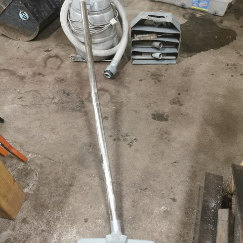 Nilfisk GD 930 S60 støvsuger med tilbehør, herunder slange, rør og flere støvsugerposer. Støvsugeren er velegnet til generel rengøring og har en kompakt, rund form i beige farve.