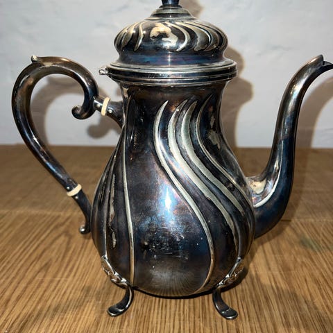 Antik sølvplet tekande og flødekande sæt med dekorative detaljer og ben. Tekanden har en buet tud og håndtag, mens flødekanden har en rund form med et håndtag. Begge dele er velegnede til servering af te og fløde. Materialet er sølvplet, og designet har en klassisk stil.
