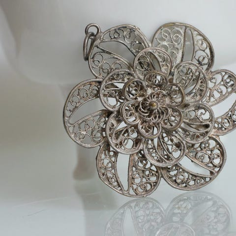 Smukt og unikt håndlavet vedhæng udført i klassisk filigranteknik. Designet forestiller en elegant blomst med flere lag fine kronblade, der giver smykket dybde og lethed.
