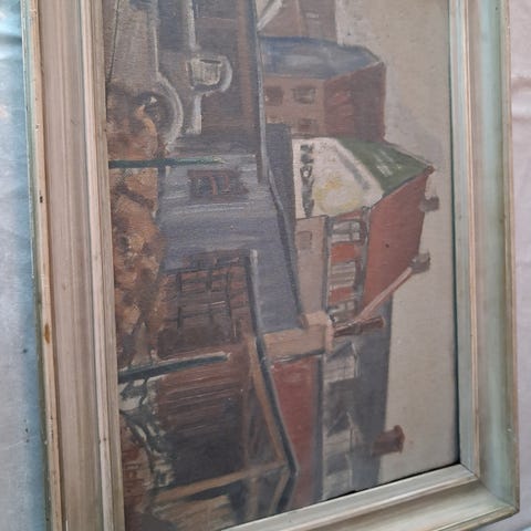 Maleri med gadebillede motiv udført i oliefarver på lærred. Indeholder detaljer af bygninger og personer i en byscene. Indrammet i en træramme. Mål ca. 50x60