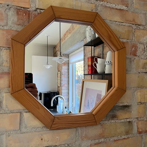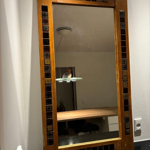Fint, ottekantet spejl med ramme af egetræ. Mærkat fra TW Spejlet på bagsiden. Måler 45x45x3 cm. Spejlet har et par enkelte, små ridser på glasset, men er ellers i ualmindelig fin stand.