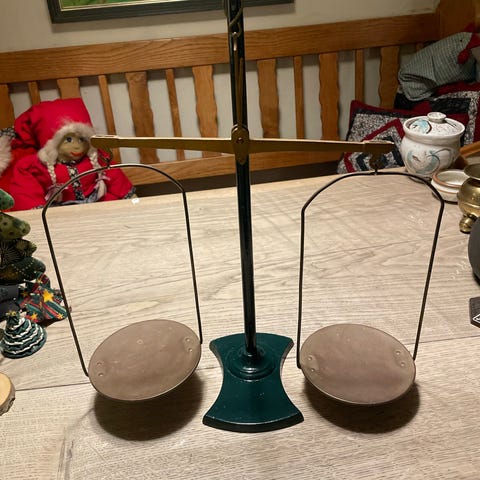 Vintage metal vægt med to runde skåle. Vægten er lavet af metal og har en klassisk balancevægt design. Den har en højde på cirka 42 cm og bruges til at afveje genstande ved hjælp af de to skåle, der hænger på hver side af vægten.