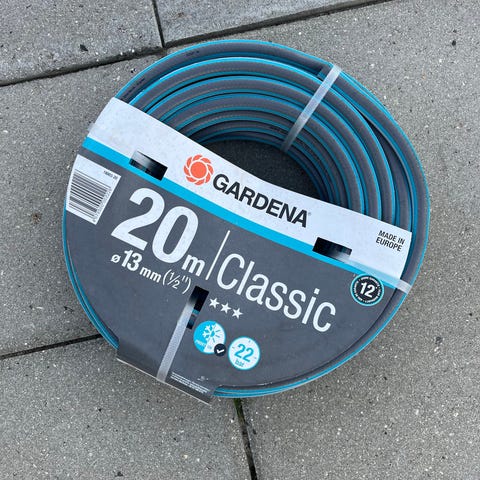 Gardena spiralslange med koblinger og vanningspistol. Slangen er grønn og laget av fleksibelt materiale. Den har en vanningspistol med justerbar stråle og koblinger for enkel tilkobling til vannkilde. Passer til hagevanning og utendørs bruk.
