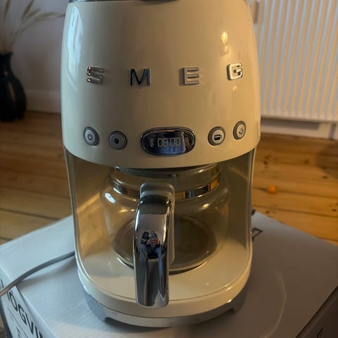 Smeg kaffemaskine med integreret kaffekværn, fremstillet i rustfrit stål. Maskinen har en kapacitet til at brygge kaffe og inkluderer en kværn med justerbar formalingsgrad. Designet til at tilbyde friskkværnet kaffe direkte ved brygning. Velegnet til hjemmebrug.