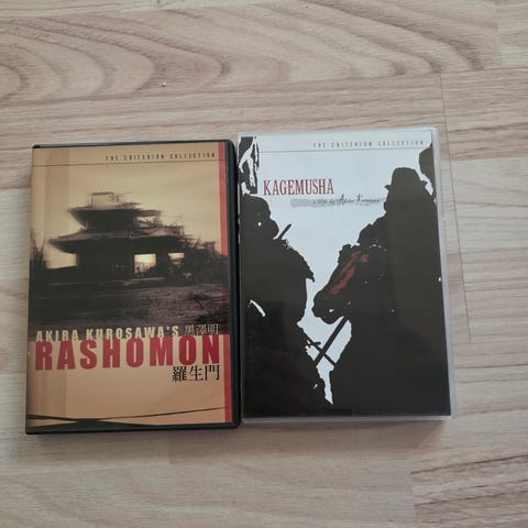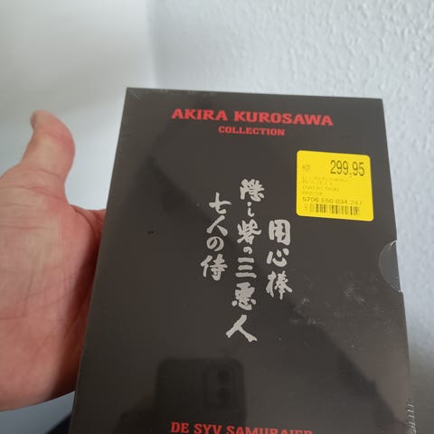 Akira Kurosawa Collection DVD featuring films including De Syv Samuraier, Den Skjulte Fæstning, and Livvagten. The set is presented in a black case with red and white text.