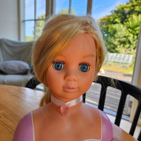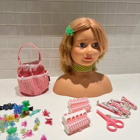 25 cm bred sminkedukke/frisørhoved, som har sugekopper i bunden, så det ikke glider rundt, når hovedet skal pyntes.