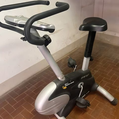 Proteus spinningcykel i grå färg med digital display som visar RPM, hastighet, tid, distans, kaloriförbrukning och puls. Cykeln är avsedd för inomhusträning och har justerbart sadel och styre för anpassad komfort.