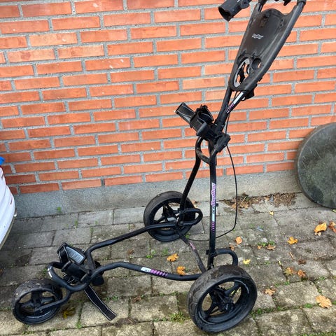 Golfvogn lavet i let metal med tre hjul.