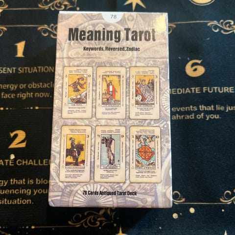 Primary Beginner Tarot kortspil i engelsk og spansk udgave. Indeholder forskellige tarotkort med illustrationer, herunder Wheel of Fortune kortet. Designet til begyndere og til brug i tarotlæsning.