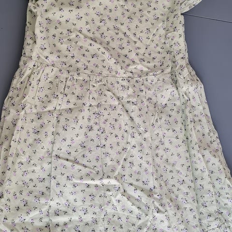 Lysegrøn kjole med knapper og lille sløjfe ved maven. Lidt åben foran med kig til lidt af maven.