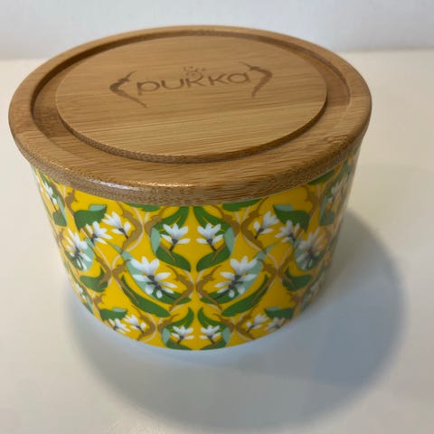 Fin og dekorativ Pukka keramik krukke med låg af træ. Krukken har et smukt mønster i varm gul, grøn og hvid, og passer perfekt ind i både moderne og klassisk indretning.
