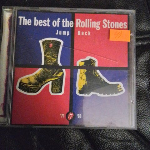 The Rolling Stones CD featuring a collection of popular tracks. The CD is housed in a standard jewel case with cover art displaying two boots on a red and blue background. The back cover lists the included songs. The disc itself is red with black and blue accents.