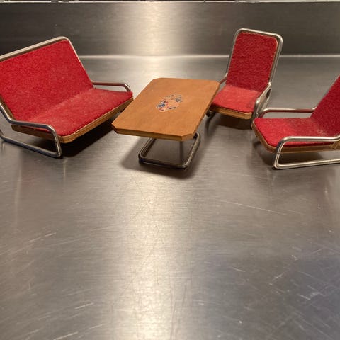 Vintage russisk sofagruppe - lidt større end dukkehusstørrelse fra 1980’erne. Sofa, 2 stole og rundt bord.