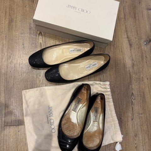De fineste flats i sølv, størrelse 39, fra Jimmy Choo sælges, da jeg ikke kan bruge dem alligevel. De er aldrig brugt, men har dog en lille skade ved hælen på den ene af dem, som kan ses på billede tre. Derfor sælges de også billigt.