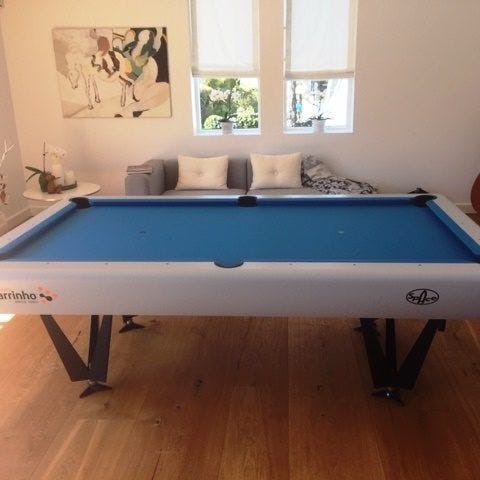 Billardbord med grøn filt, træramme og robuste sorte ben. Passer til indendørs brug og fritidsaktiviteter. Leveres uden køer og kugler.