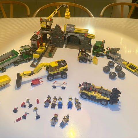 LEGO City Mine Excavation Set børnelegetøj med byggeklodser, der inkluderer en minearbejderlastbil, gravemaskine, lastvogn og tilbehør. Sættet er designet til børn og indeholder detaljerede modeller i farverne gul, grøn og grå.