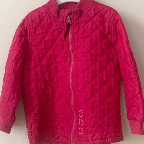 Brugt grå termojakke i str. 104 fra Mikk-Line. Der ses slid på begge ærmer (se billede 6). Ellers fremstår den i fin stand.