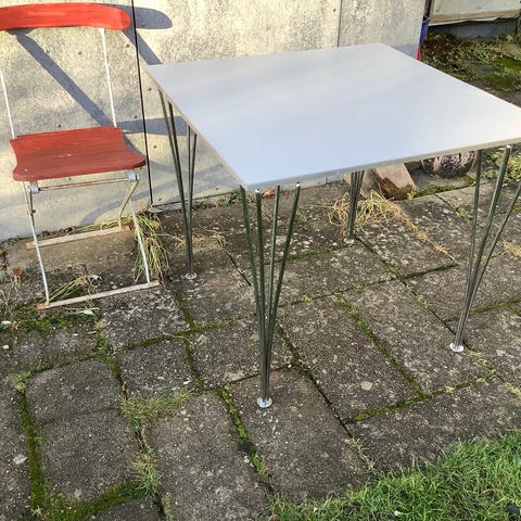 Piet Hein Bord fra Fritz Hansen : Bord blev designet af Piet Hein , Bruno Mathsson og Arne Jacobsen i 1968 : MADE IN DANMARK 1994 : Mål : 72 - 120 - 80 cm. Bord med forkromede stålspændben : Bordplade : Laminat ( Felix ) Hvid : Bordkant : Aluminium / Børstet - Mat : Stel. : Stål / Forkromet Stål - Blank : Bordhøjde : Stelhøjde 72 cm : Bord : Pris2700.kr.SENDER IKKE HENT SELV :