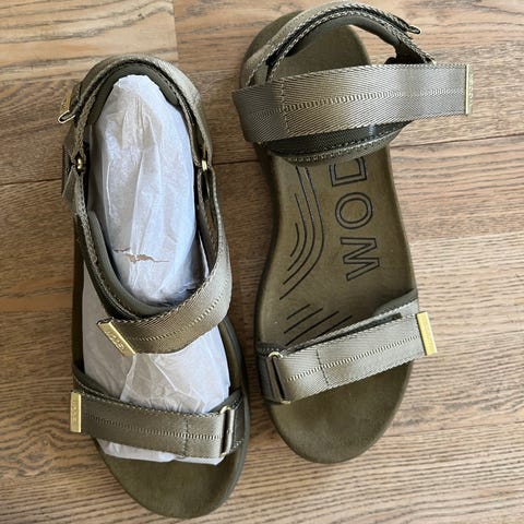 Superflot, farven er lilla/syren og lys camel/caramel/coffee. Virkelig fine. Lækre og gode at gå i. Dansk produkt. Nypris op til 650 kr. Desværre købt for store, og dén internetbutik havde dårlige returvilkår.