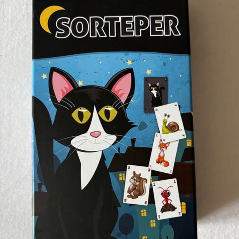 Dette er et Sorteper kortspil med spillekort og en indpakningsæske. Kortenes design inkluderer motiver af sorte katte mod en farverig baggrund. Spillet omhandler at samle par og undgå at sidde med kortet af den sorte kat. Størrelsen af æsken er 2x12x9 cm.