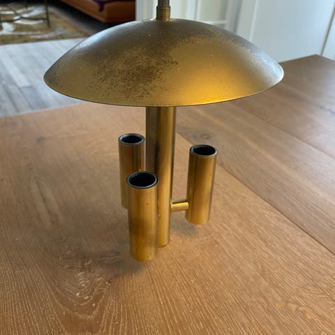 Carl Thore lampe designet med 3 messing ringe omkring en hvid yderskærm og rød inderskærm.