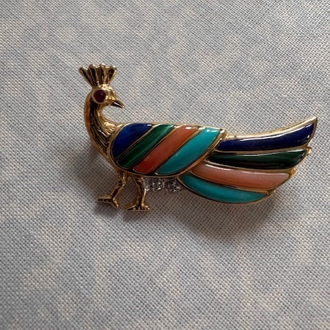 Forgyldte fuglebrocher til kvinder. Brocherne er designet med detaljer, der fremhæver fuglens form og farver, egnet som tilbehør til beklædning.