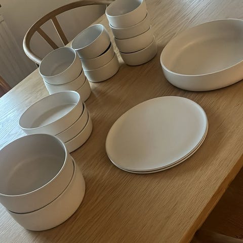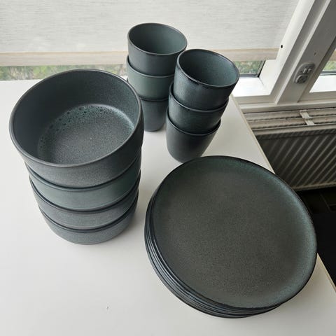 Kun 1 middags tallerken har et skår. Bemærk at det er et tungt service. 8 tallerkener middag og frokost og dybe. 4 kopper