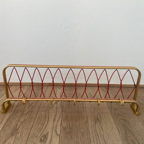 Gammel hattehylde i hvid plast samt med messing ramme.