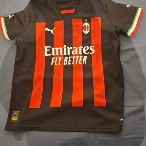 Puma AC Milan fodboldtrøje med sort og rød stribet design. Trøjen har AC Milan-logo på brystet, Puma-logo og sponsormærker. Materialet er let og egnet til sport og fritidsbrug. Trøjen er designet til voksne og har kortærmede.