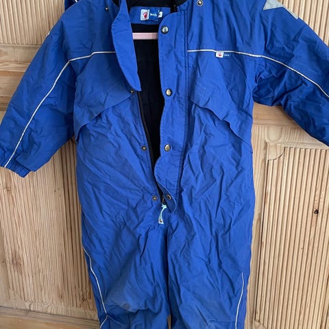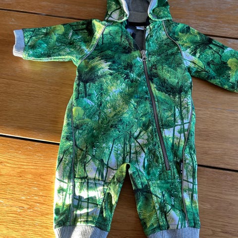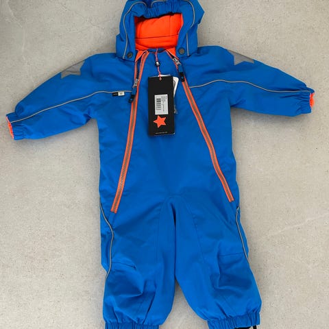 Molo dreng flyverdragt i størrelse 68, farven blå. Der er et mindre hul, som ses på billedet, men har ingen betydning for brugen og går ikke gennem foret