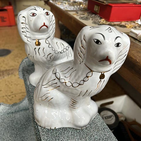 Et par af porcelæn, Staffordshire, England, 19. århundrede. Et sjældent og dekorativt par rishunde, fremstillet i porcelæn i Staffordshire i 1800-tallet. Rishunde – ofte stiliserede og med udtryksfulde ansigter – blev populære som dekorative figurer i engelske hjem og afspejler fascinationen af både eksotiske og hjemlige dyremotiver.