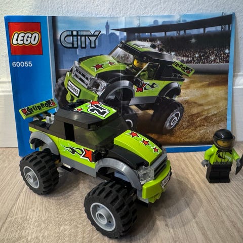 LEGO City 60055 Monster Truck legetøjssæt i grøn farve. Sættet inkluderer en monster truck og en minifigur, egnet til børn i alderen 5-12 år. Materialet er plast, og sættet er en del af LEGO's City tema.