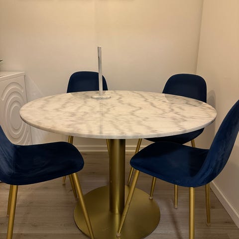 Står som nu dog er er en enkelt plet på en af stolene. Men det kan fjernes. Bordet kan klappes sammen så den bliver lille og rund.