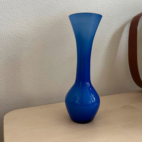 Skøn stor gammel unika mundblæst vase i smukkeste due blåt glas og med kant støvet eller douce orange kant øverst