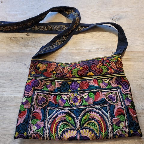 Stof dame taske med perlebroderi og lang rem. Tasken har dekorative perler og broderede blomsterdetaljer, hvilket giver et unikt udseende. Velegnet til brug ved særlige lejligheder.