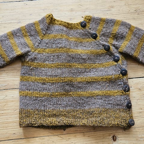 Ulden kjole i vissengrøn hjemmestrik. Fra hjem uden røg og husdyr. Se mere børnetøj på foto nr 2