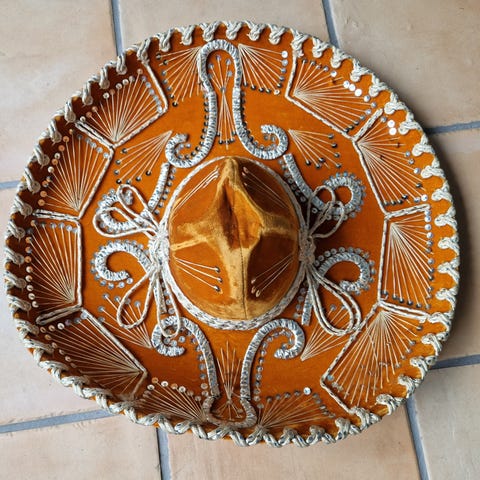 Mexicansk sombrero i sort filt med detaljerede dekorative mønstre i beige og hvide nuancer. Hatten har en bred skygge og en rund krone med indvendig svedbånd. Designet inkluderer flettede og broderede elementer samt en farverig fjeredekoration. Velegnet som traditionelt hovedbeklædning eller som dekorativt element.