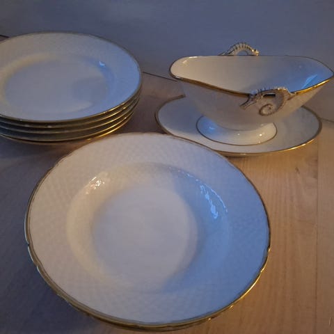 Stel bestående af 12 middagstallerkener, 10 frokosttallerkener og 12 dybe tallerkener, to sovsekander, en skål, to små tallerkener til smør eller lignende, en skål med låg og 6 serveringsfade i forskellig form og størrelse. Fejler intet. Sælges helst samlet. Giv et (realistisk) bud!