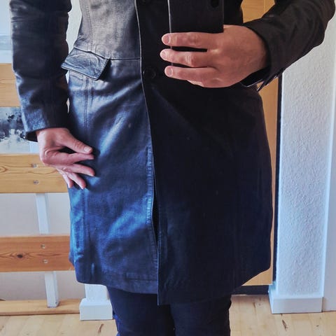 Lækker skindjakke med aftageligt bælte og lommer. Aldrig brugt. Str. medium. Bryst: 50 cm tværs over x 2. Længde fra skulder 77 cm.