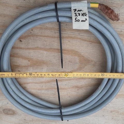 Ca. 65m i 2 længder. Omkring (39m (23kg) 2000kr og 25m (14kg) 1300kr).