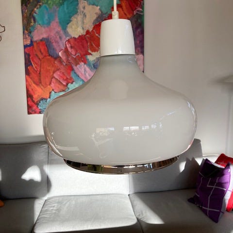 Pendel loftslampe med hvid finish. Lampen har et cirkulært design med flere skærme, der fordeler lyset jævnt. Egnet til ophæng i loft. Diameter 42 cm