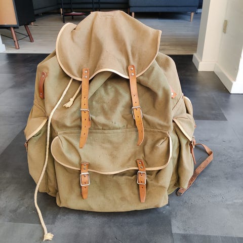 Bergans rygsæk. Virkelig cool retro vandrerygsæk i gul. Den er letvægts og sidder godt. Den ene syning ved sidelommen er gået løs og skal syes fast. Der medfølger stropper.