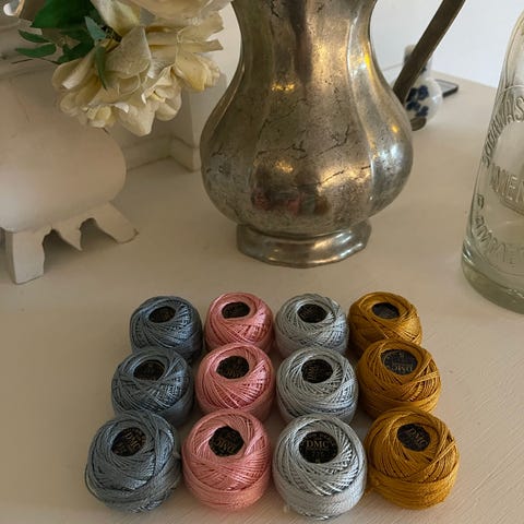 200 g hvidt og 200 g rødt bomulds perle garn + 1 nøgle guld garn, 8 metal ringe: 4 runde 16 og 20 cm ø og 4 hjerteformede 15 og 18 cm høje (malingen er skallet lidt af på nogen af dem).