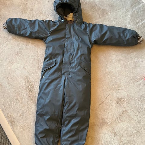 Wheat Unisex Børnedragt i størrelse 110, farven grøn. Dragten er designet til børn og er egnet til udendørs brug. Den har en hætte, elastiske manchetter ved ærmer og ben for bedre pasform og beskyttelse mod vejr. Materialet fremstår som vandafvisende og velegnet til aktiv leg. Perfekt til efteråret. Lille hul bagpå er lappet med en vandtæt lap