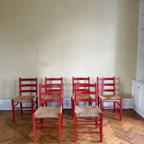 Er i rigtig fin stand. Den ene lidt mere brugt end den anden. Man sidder rigtig godt i dem. De er solide. Ryghøjden 80cm