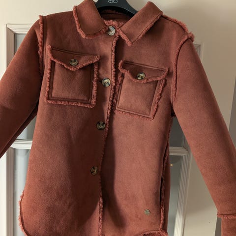 POMPdeLUX børnetøj sæt i størrelse 128 til piger, farve lilla. Sættet består af en jakke og bukser, velegnet til udendørs brug. Dejligt varmt, dog med hul på knæerne.