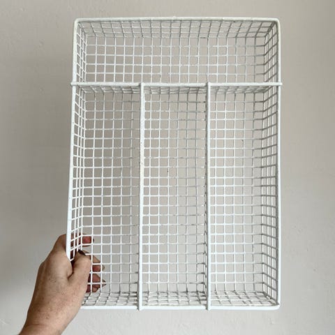 Dekorativ bakke i metaltråd. Kan stå fremme til dekorative formål eller bruges i en skuffe som bestikbakke.