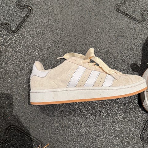 Adidas Campus sneakers i grå ruskind med hvide striber og gummisål. Skoene er størrelse 42 og har en klassisk lav profil. Velegnet til hverdagsbrug.