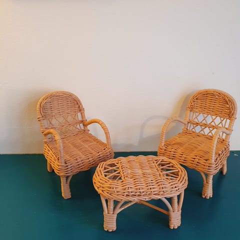 Virkelig søde flettet børnemøbler. Sættet består af 2 stole og et bord. Materialet er i bambus / rattan